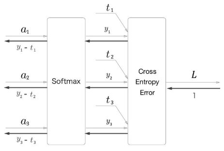 Softmax의 출력 (y1,y2,y3)와 정답 레이블(t1,t2,t3)를 받고, 이 데이터로부터 손실 L을 구해 출력합니다.