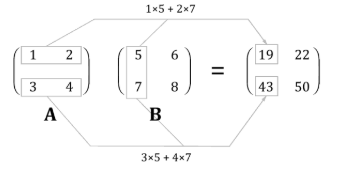 - 행렬의 곱 : '왼쪽 행렬의 행벡터'와 '오른쪽 행렬의 열벡터'의 내적(원소별 곱의 합)으로 계산합니다.