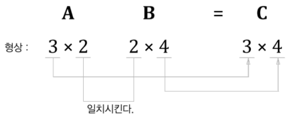 위의 그림에서 보듯, 행렬의 곱에서는 대응하는 차원의 원소 수가 일치 해야합니다.