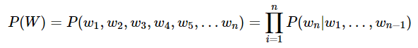 전체 단어 시퀀스 W의 확률은 모든 단어가 예측되고 나서야 알 수 있으므로 단어 시퀀스의 확률은 다음과 같습니다.