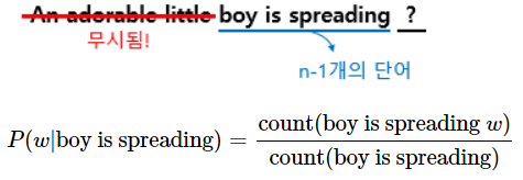 예를 들어 'An adorable little boy is spreading' 다음에 나올 단어를 예측하고 싶다고 할 때, n=4라고 한 4-gram을 이용한 언어 모델을 사용한다고 하면, spreading 다음에 올 단어를 예측하는 것은 n-1에 해당되는 앞의 3개의 단어만을 고려한다.