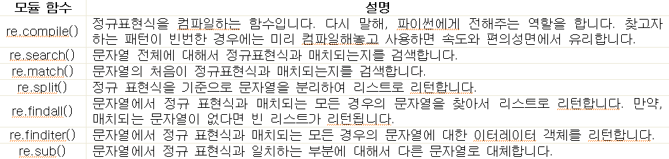 정규표현식 모듈에서 지원하는 함수는 다음과 같다.