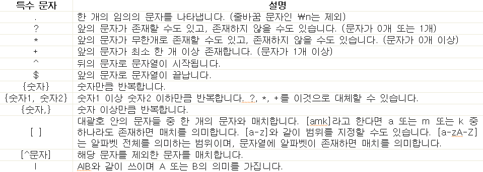 정규 표현식을 위해 사용되는 문법 중 특수 문자들은 아래와 같다.