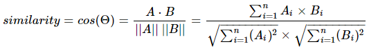 두 벡터 A, B에 대해서 코사인 유사도는 식으로 표현하면 다음과 같다.