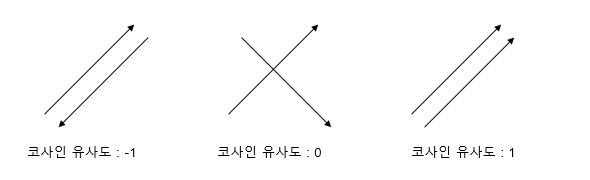 두 벡터의 방향이 완전히 동일한 경우에는 1의 값을 가지며, 90°의 각을 이루면 0, 180°로 반대의 방향을 가지면 -1의 값을 갖게 된다.